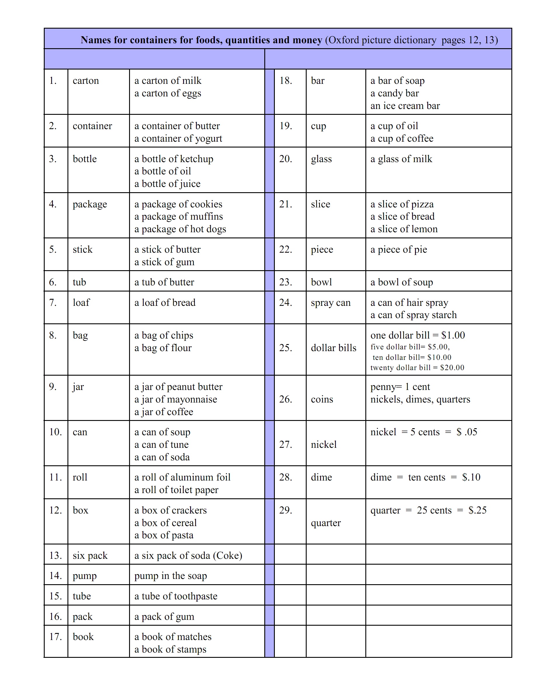 Pdf printable copy of words for: kitchen containers, quantity and money