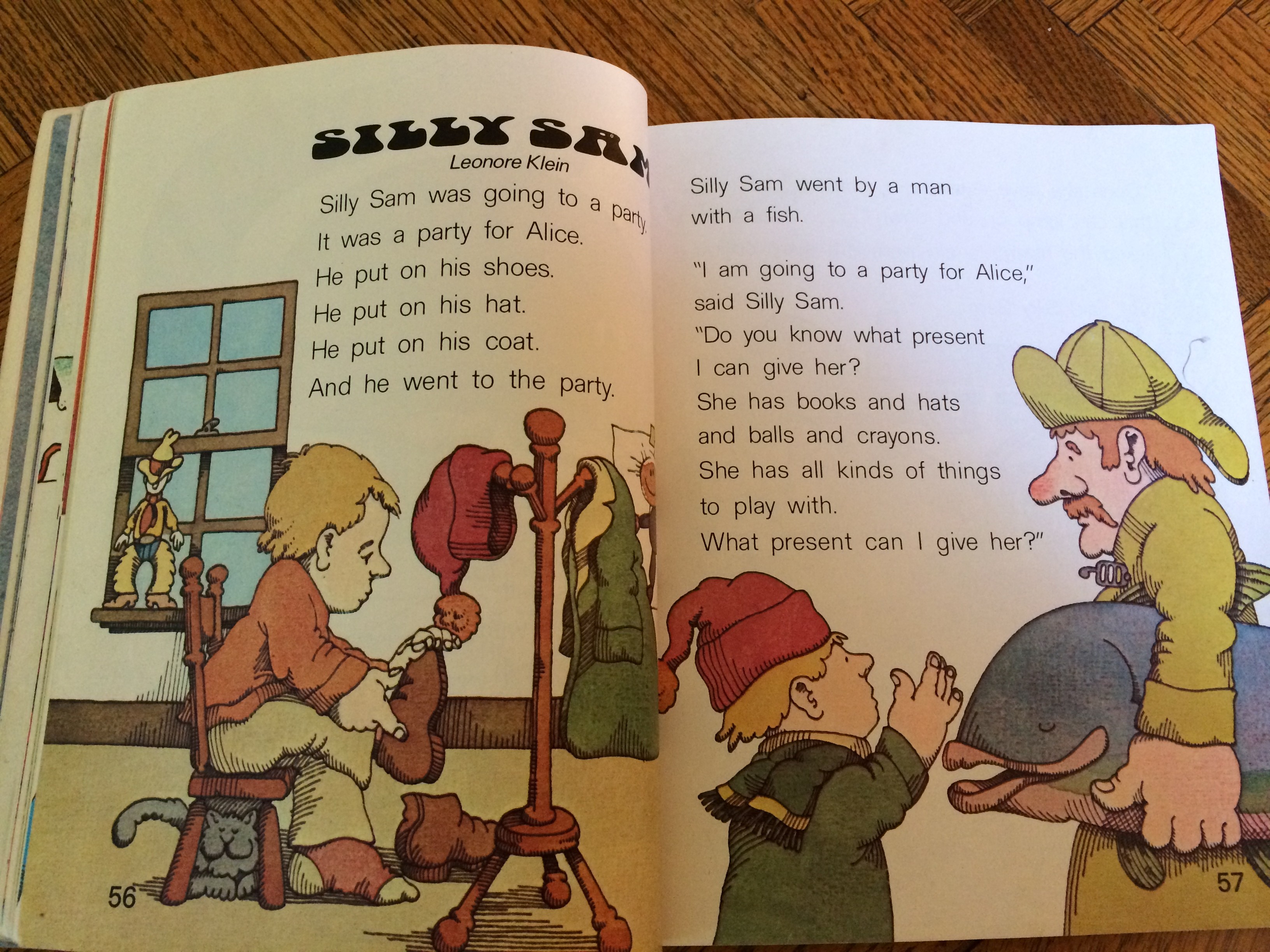 “I am going to a party for Alice,” said Silly Sam. “Do you know what present I can give her? She has books and hats and balls and crayons. She has all kinds of things to play with. What present can I give her?”