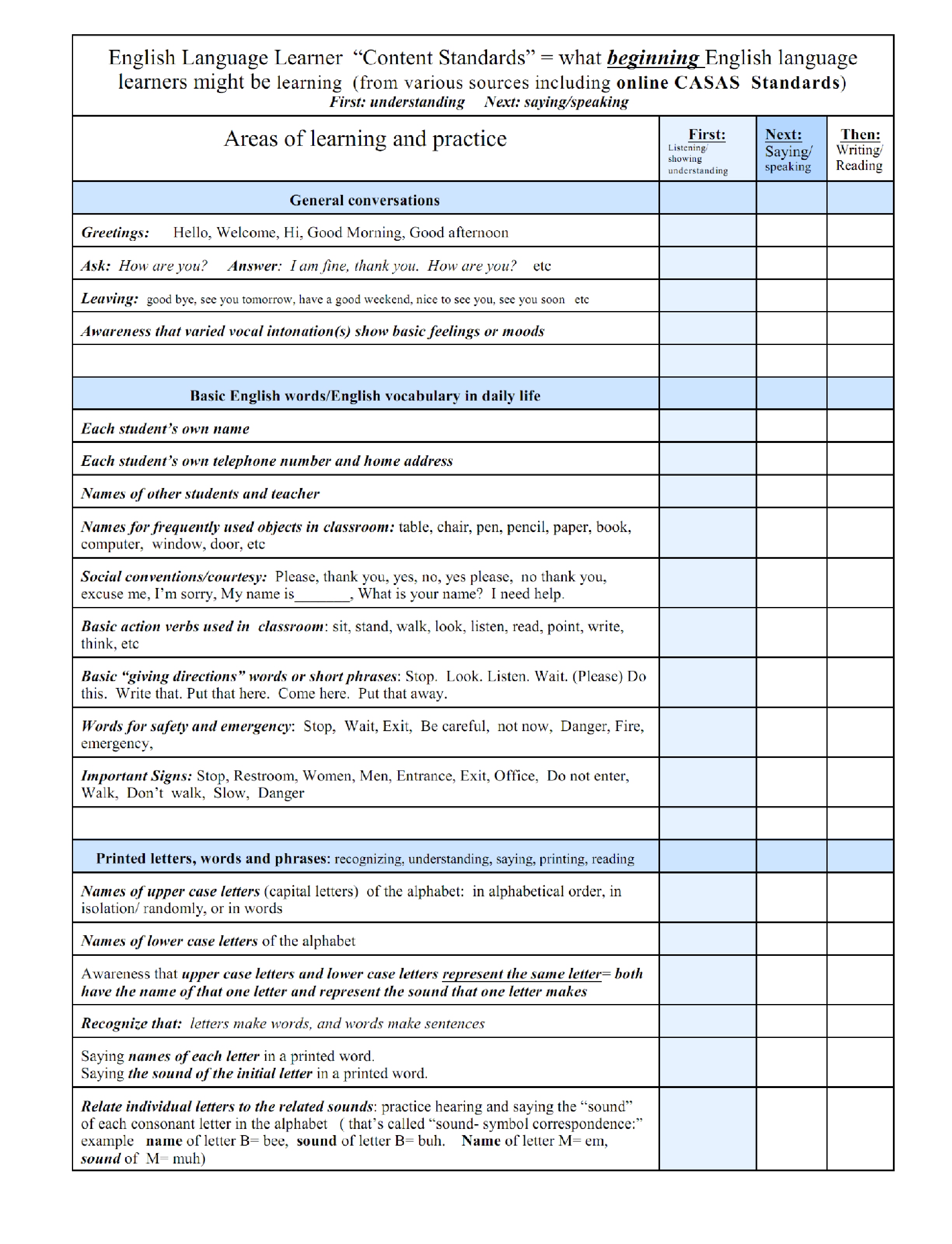 Link to printable PDF copy: Beginning English Language Learner Standards and Goals